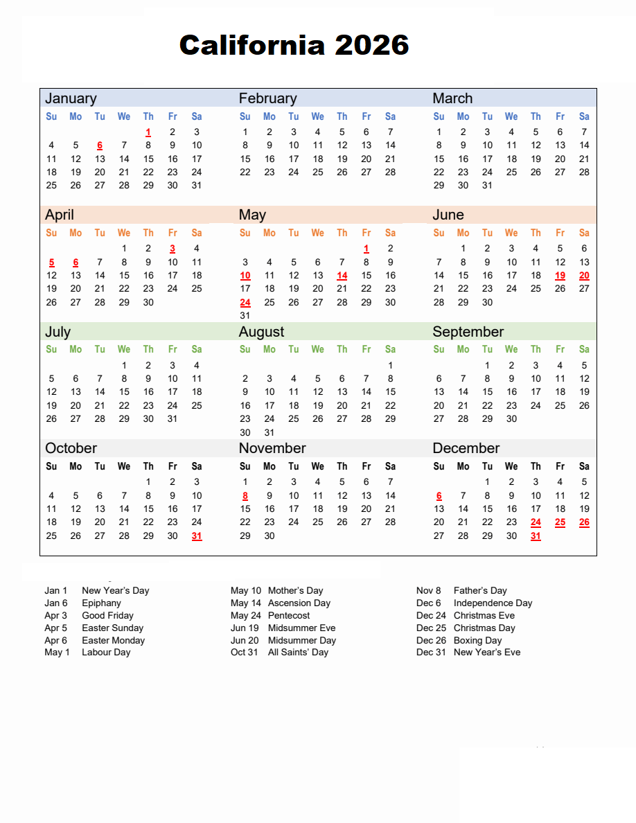 California 2026 Calendar With HolidayBy CS / February 17, 2026 Click to rate this post! [Total: 0 Average: 0]