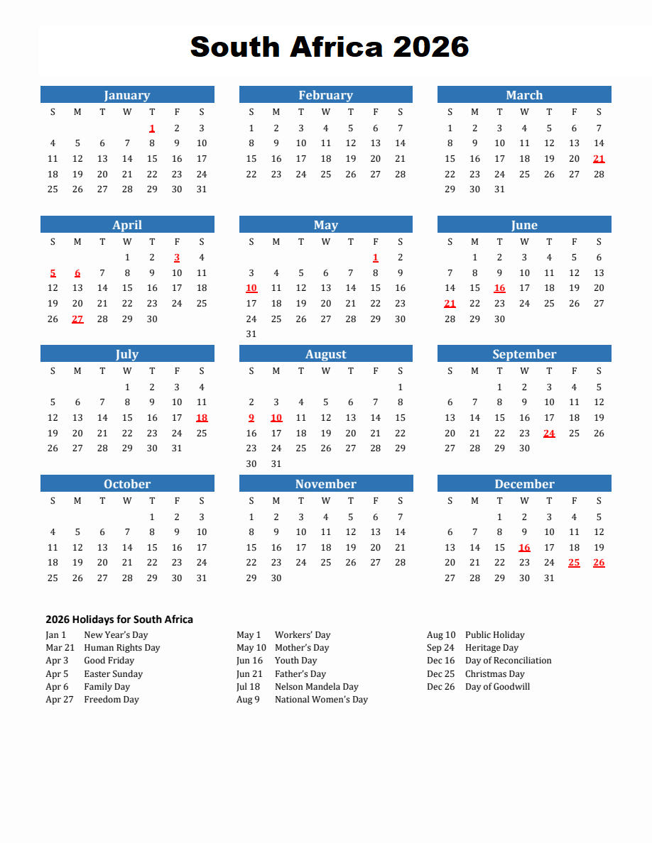 South Africa 2026 Calendar with HolidaysBy CS / February 5, 2026 Click to rate this post! [Total: 0 Average: 0]
